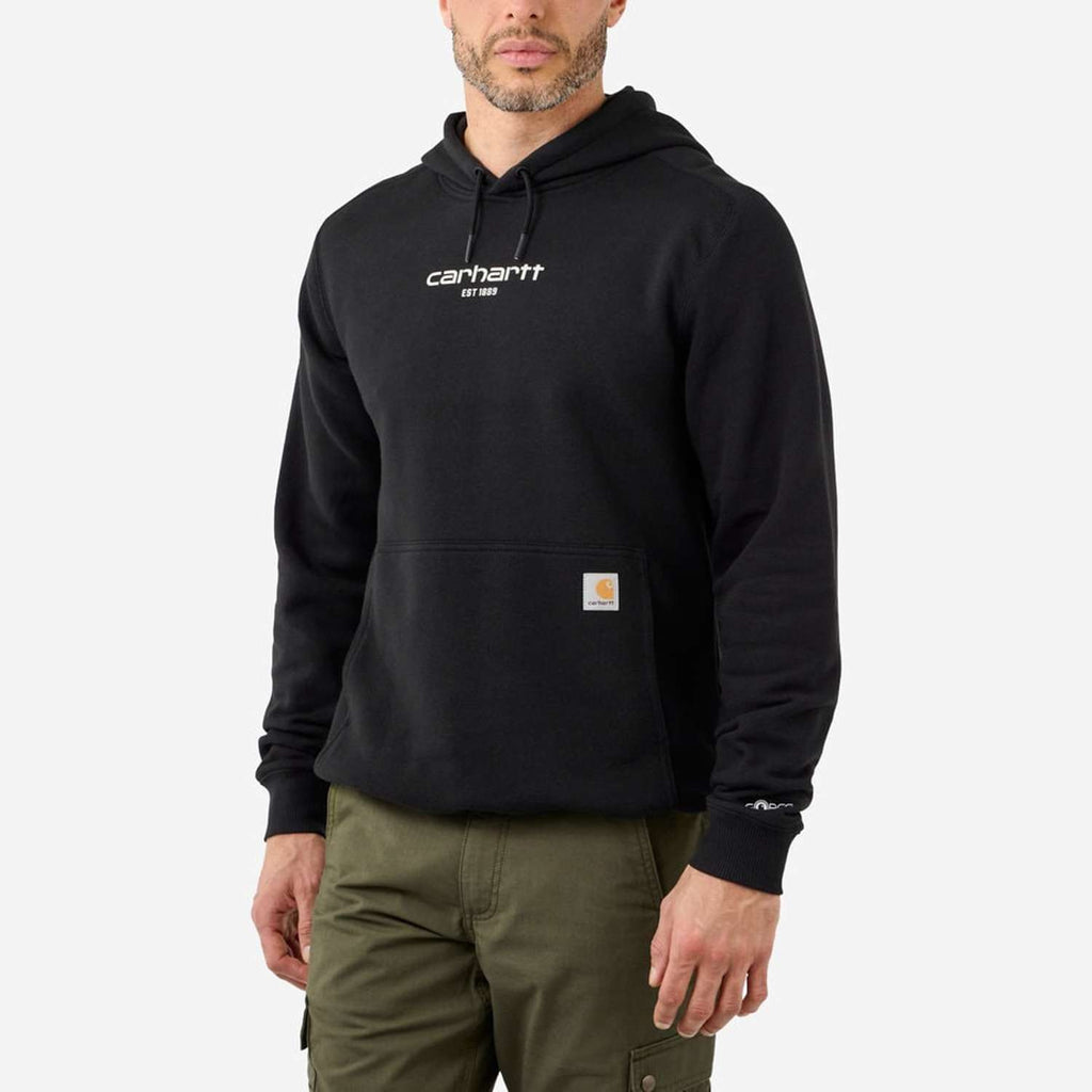Denne Carhartt force logo sweatshirt er udviklet med teknologi Force. Det betyder at hættetrøjen er svedtransporterende, hurtigtørrende og smudafvisende. Den forhindre lugt med anti-mikrobielle egenskaber, så du kan svede i den uden at lugte. Du finder en tredelt hætte med justerbar snorelukning, to frontlommer med skjult telefonlomme som kan bruges som håndvarmere. Der sidder en Carhartt logo trykt på brystet samt en lille Carhartt label syet på lommen foran. Denne sweatshirt er desuden god hvis det blæser udenfor, da der er ribstrikkede manchetter samt taljebånd. Med andre ord, forhindrer den vinden i et trænge igennem ved de udsatte områder. Pasformen på denne sweatshirt er afslappet og løstsiddende.