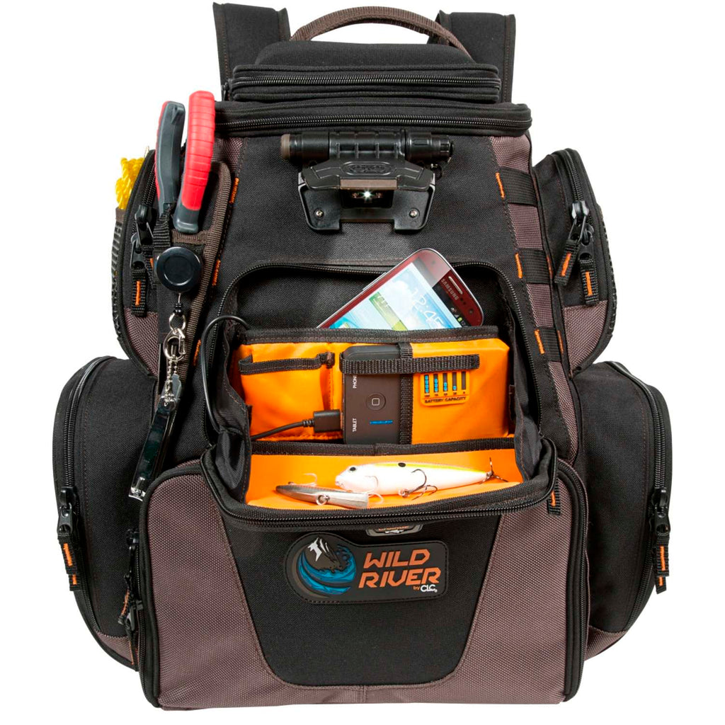Wild River Nomad® XP rygsækken med lys har en integreret genopladelig USB-strømforsyning på 5.000 mAh, som er designet til at oplade små bærbare elektroniske enheder. Den har også et integreret LED-lyssystem med 3 niveauer, som kan drejes og dermed oplyse såvel rygsækkens inderside og det udvendige arbejdsområde. Derudover kan den rumme op til seks kasser i 3600-serien og fire kasser i 3500-serien.