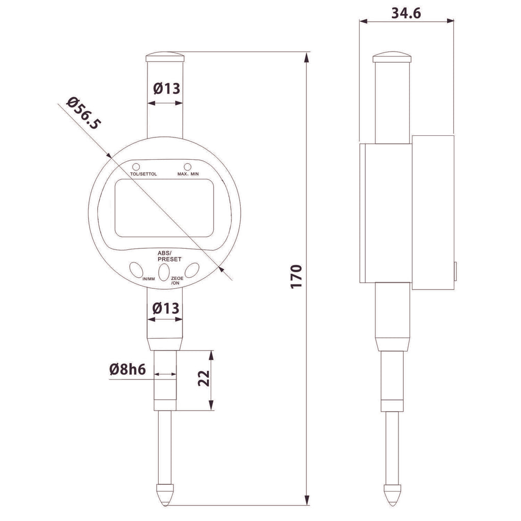 Digitalt præcisions måleur diameter Ø56 med metalkabinet og hærdet og slebet Ø8 mm h6 opspændingsskaft. Med omskift mm/tommer, ABS, tolerance, nulstilling, dataudgang og med flad bagplade. Bagplade med øje medfølger. Måleuret kan med fordel anvendes sammen med USB datafanger der leverer alle måleresultater til valgfrit program på ens arbejdsplads. Med flad bagplade, øje medfølger. Aflæsning: 0,01mm.