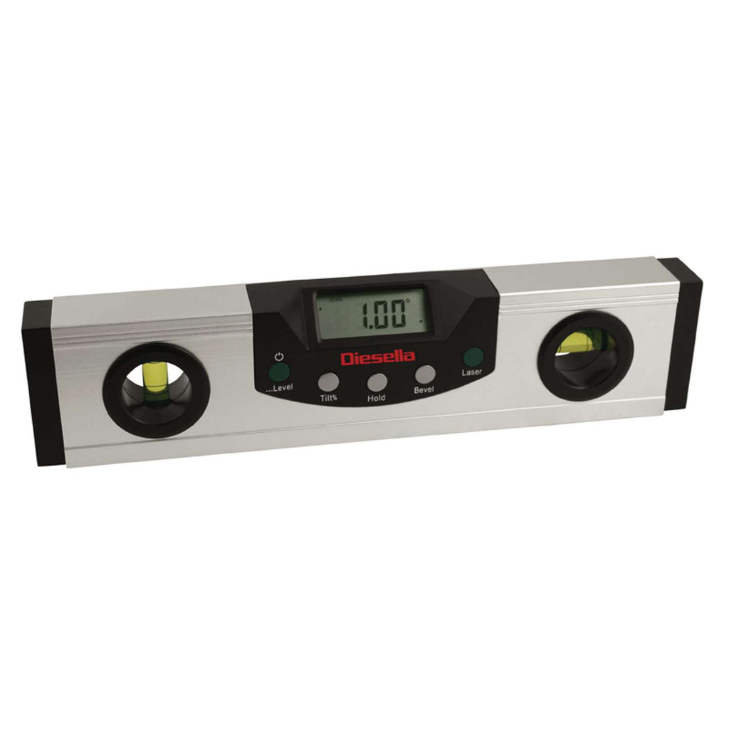 Elektronisk vaterpas med krydslaser og LED lys - måler i grader eller procenter. Måler vinkler i 0,10 trin, HOLD funktion, automatisk vending af tal for nem og hurtig aflæsning, autosluk efter 5 min., nulstilling, ABS funktion, husker 0-punkt. Måleområde: 4 x 90° (360°); 4 x 100%. Er udstyret med magneter i bunden. Leveres med stoftaske samt 1 stk. batteri E/ 9V.