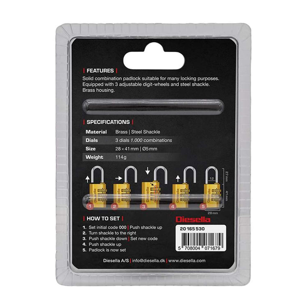 DIESELLA Kodehængelås 28mm messinghus og stålbøjle 3 cifret