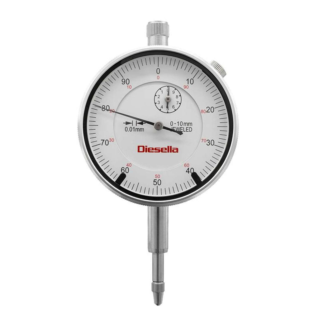 DIESELLA Måleur 0-10 x 0,01mm DIN 878 med tolerancepile og flad bagplade + bagplade med øje