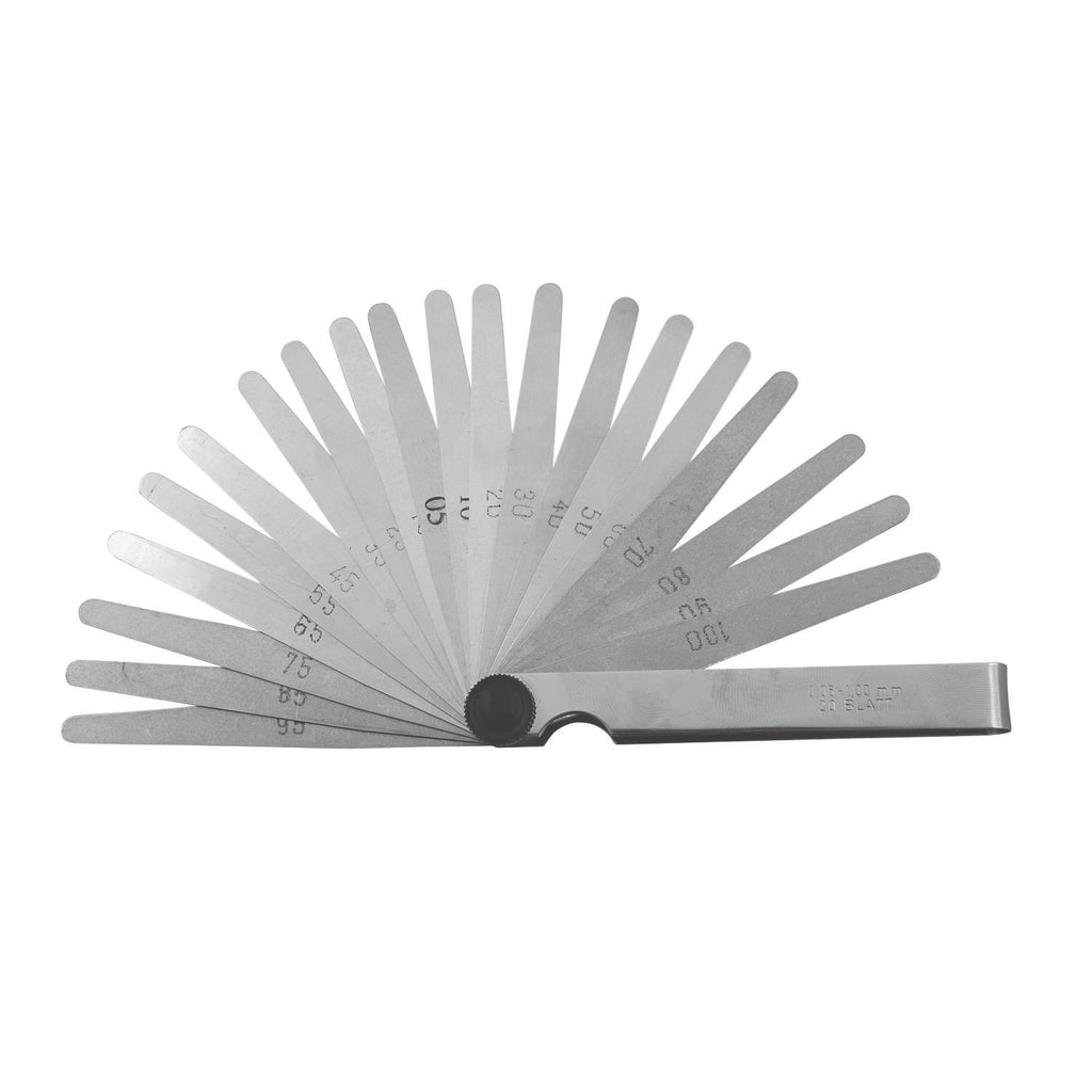 Fjederkonstante stålblade i konisk form med påskrift af tykkelse. Forniklet holder med nittet led som kan spændes. Nøjagtighed efter klasse T2.