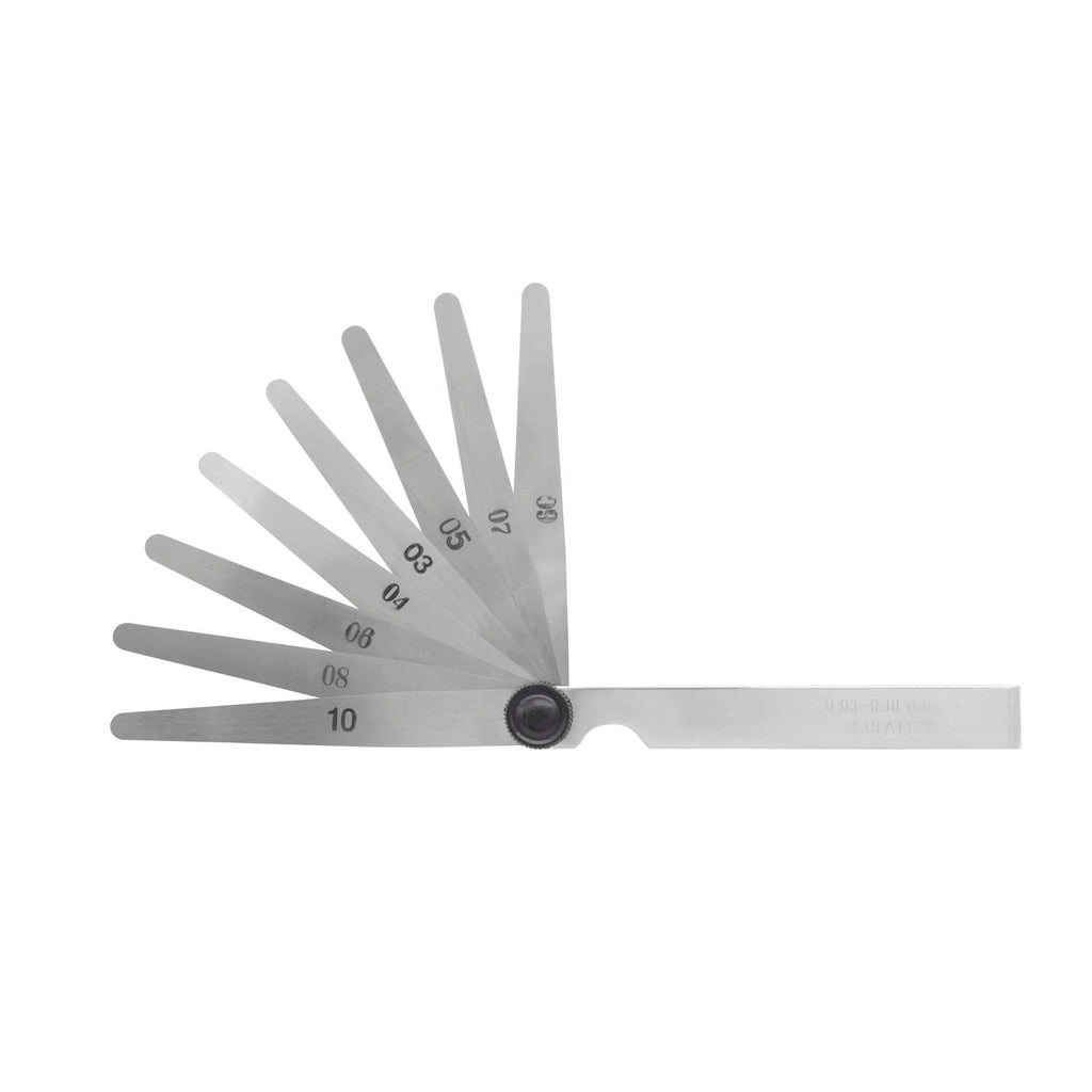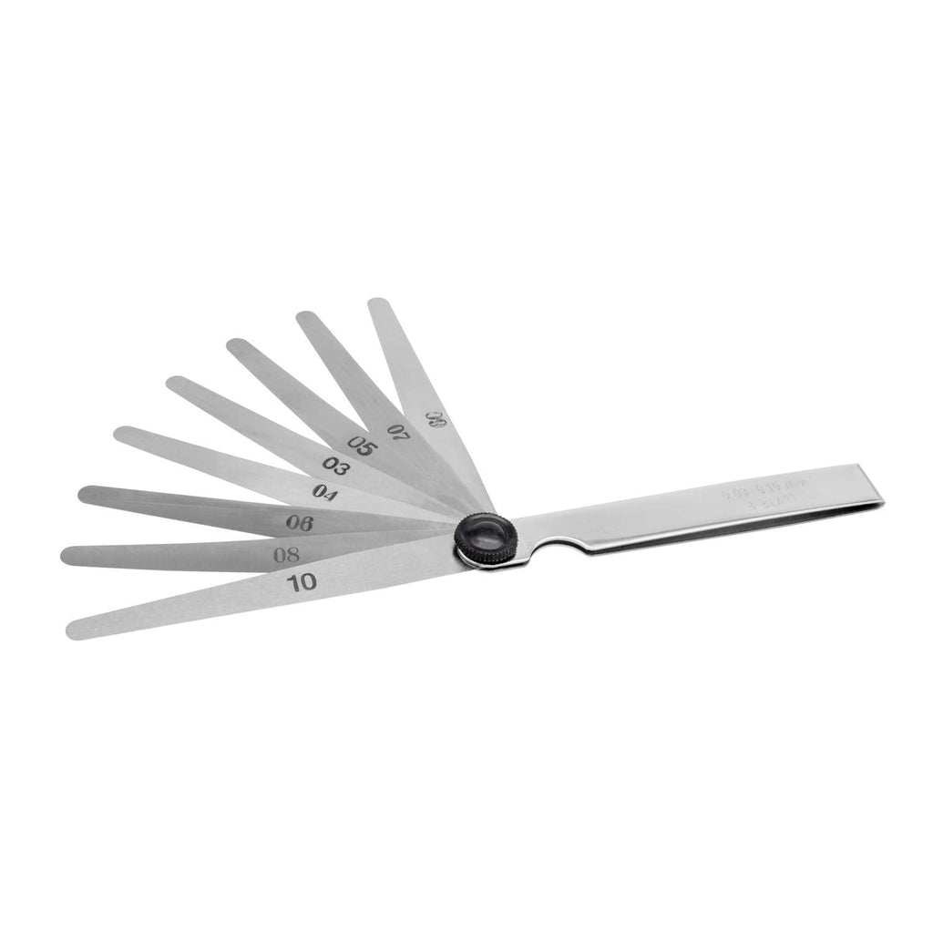 Fjederkonstante stålblade i konisk form med påskrift af tykkelse. Forniklet holder med nittet led som kan spændes. Nøjagtighed efter klasse T2. 8 blade i tykkelserne 0,03- 0,10mm: 0,03 - 0,04 - 0,05 - 0,06 - 0,07 - 0,08 - 0,09 - 0,10.