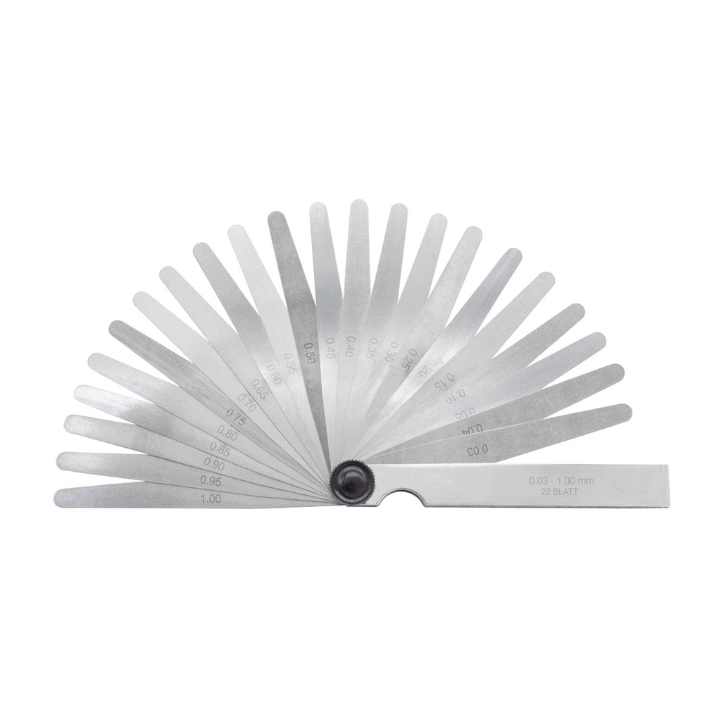 Fjederkonstante stålblade i konisk form med påskrift af tykkelse. Forniklet holder med nittet led som kan spændes. Nøjagtighed efter klasse T2.
