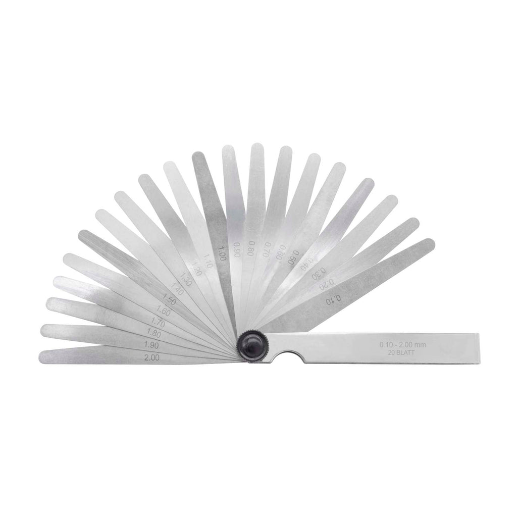 Fjederkonstante stålblade i konisk form med påskrift af tykkelse. Forniklet holder med nittet led som kan spændes. Nøjagtighed efter klasse T2.