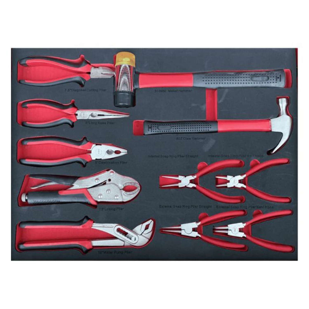 Tænger: 4 rundtænger (6”), spidstang (8”), skævbider (7”), kombinationstang (8”), vandpumpetang (10”), svejsetang (10”)