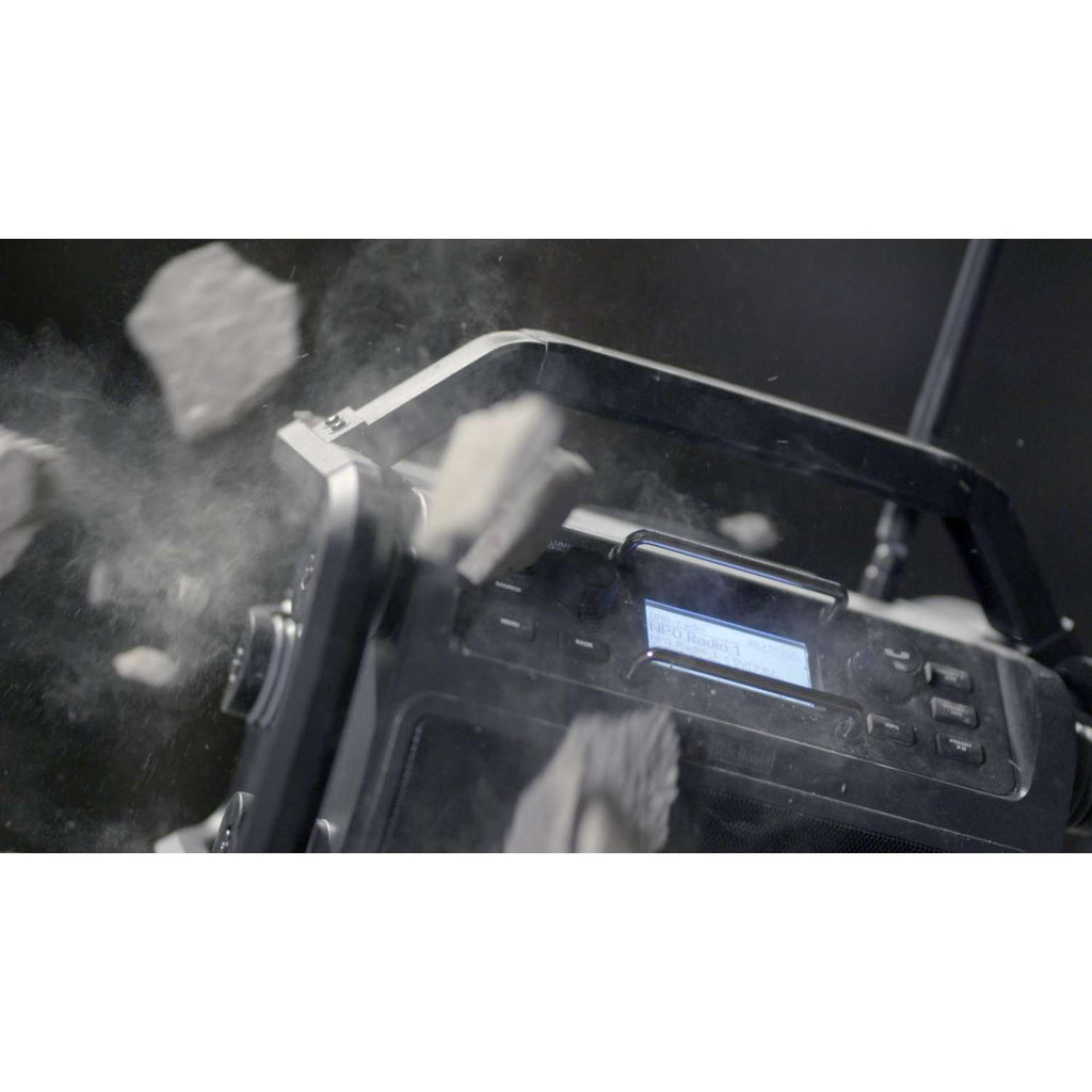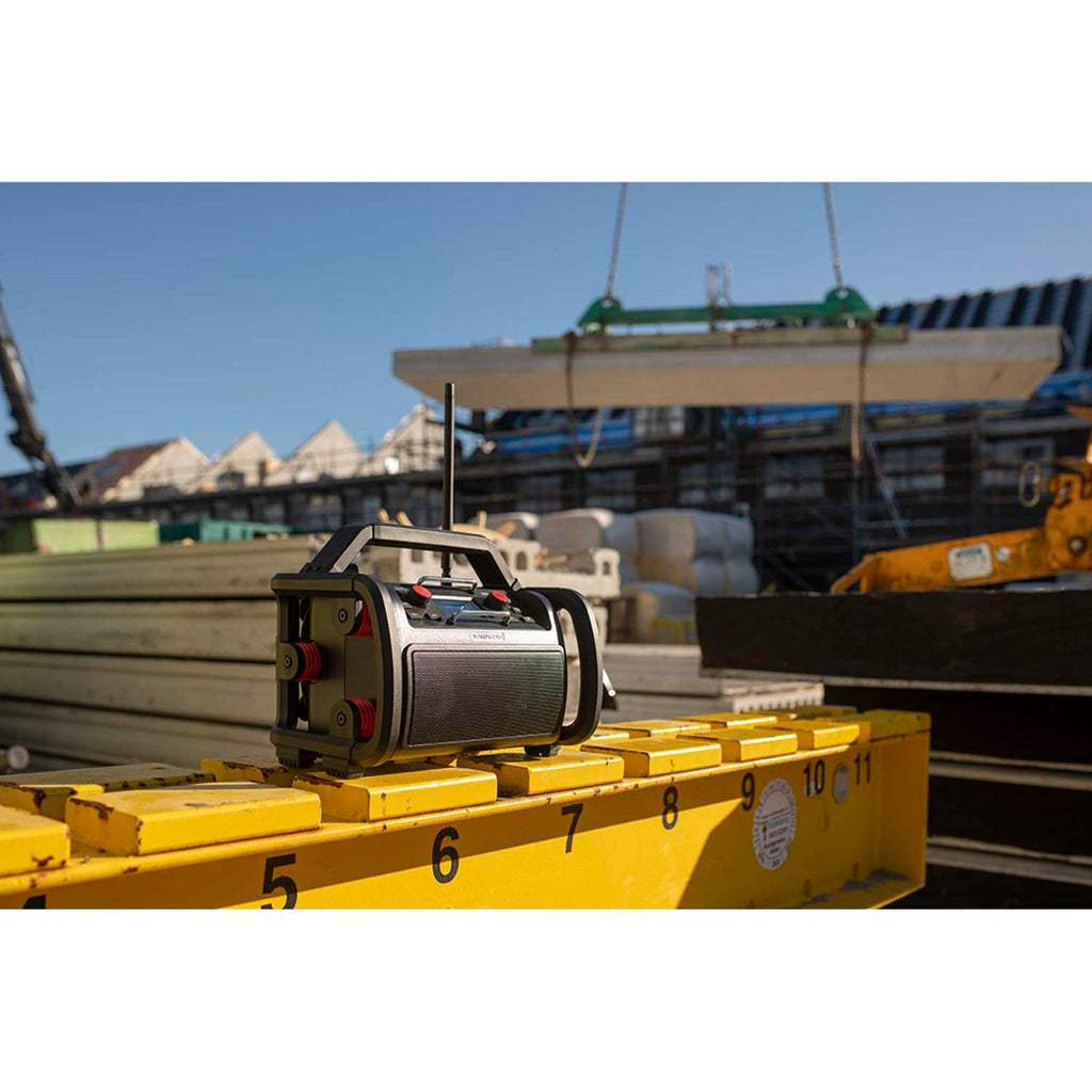 Kompakt og alsidig jobradio med stereolyd i HiFi-kvalitet. Ideel til brug både inden- og udendørs. Med indbygget mikrofon, så du kan besvare opkald uden at afbryde arbejdet. Råt design og heavy-duty-konstruktion med ramme af slagfast ABS-plast og gummiaffjedring. Fastmonteret netkabel med kabelholder for enkel opladning. Med Powerbank-funktion, så du kan oplade mobilen.
