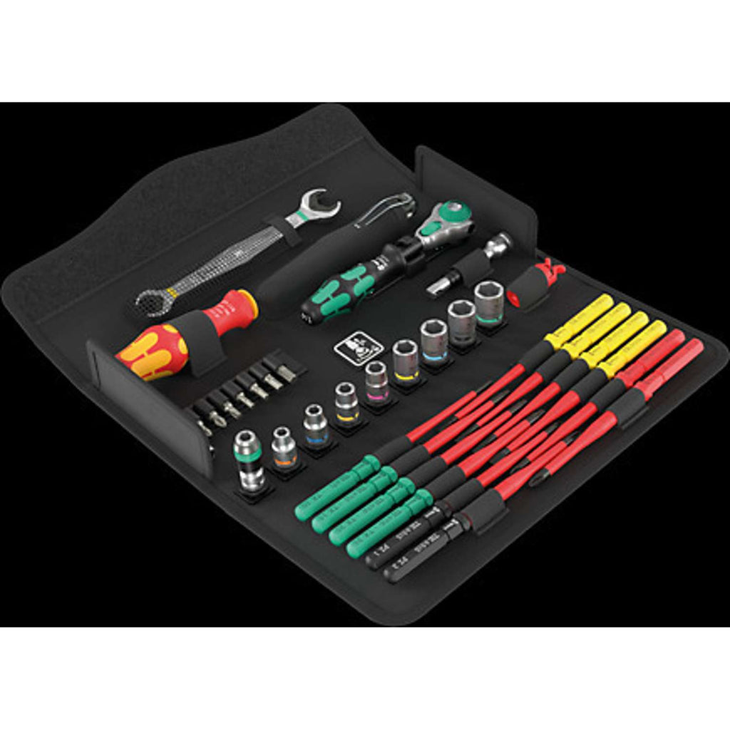 Kraftform Kompakt W 1 vedligeholdelsesarbejde, 35 deleKompakt værktøjssæt med de 35 vigtigste stykker skrueværktøj til servicearbejde indendørs og udendørs. Med VDE håndgreb samt 12 VDE klinger; 1 Joker dobbeltgaffelnøgle med holdefunktion, slutanslag, lille returvinkel og ekstrem fastbidende tænder; med den utroligt hurtige 1/4" skralde Zyklop Speed samt tilbehør; 8 manuelle og maskintoppe størrelse 5,5-13, 1 universalbitholder; 7 25mm bits; 1 skrueklo til at fastholde skruer; 1 enkeltpolet fasetester 247; tekstilboks med meget høj robusthed og lang levetid; kan stilles opretstående med henblik på overskuelig lagring i værkstedsreolen; yderligere overfladebeskyttelse via tekstilbeklædning; ringe vægt og volumen letter mobiliteten.